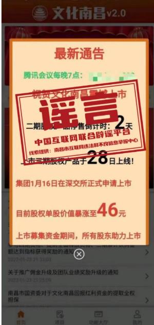真相:近日,一款名為“文化南昌”的APP以南昌市人民政府、市政投資等名義開展網(wǎng)絡集資詐騙行為,含大量偽造的官方文件,并以高利息、事業(yè)編制等誘導使用者進行投資。