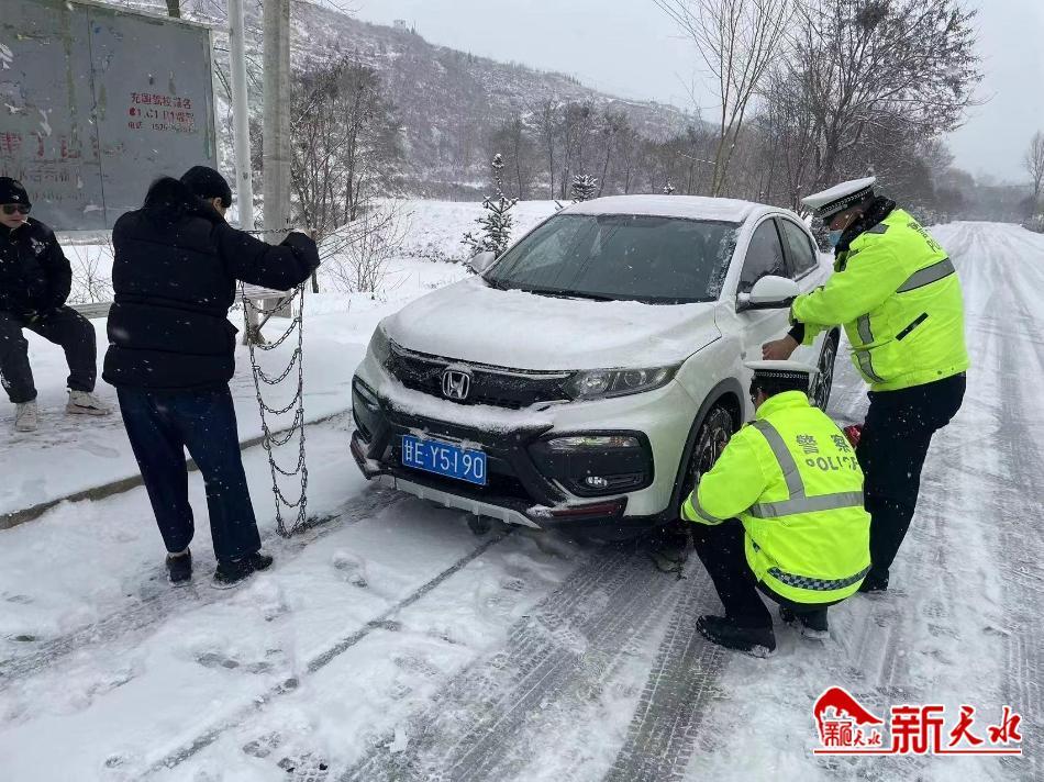 2月13日上午,一輛小轎車受困在省道221線張家川段橋溝梁。現(xiàn)場路面結(jié)冰,通行條件非常差,張家川公安交警接到求助后,立即幫助駕駛員安裝防滑鏈,并現(xiàn)場指揮引導(dǎo)其他車輛加裝防滑鏈。同時,通過微博、微信向群眾推送天氣信息,發(fā)布路況信息及交通管制狀況,引導(dǎo)廣大交通參與者合理選擇出行時間和行駛路線,提前做好安全防范工作,確保出行安全。