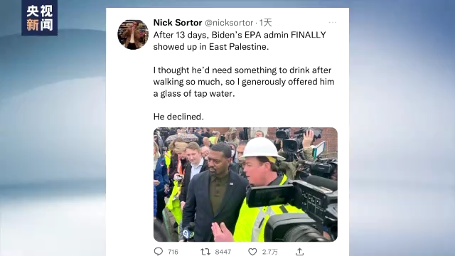 美國獨立記者尼克·索托16日發(fā)文稱,事發(fā)13天后,環(huán)保署署長里根才出現(xiàn)在東巴勒斯坦城,他向里根提供了一杯當(dāng)?shù)氐淖詠硭饪剩@位署長拒絕了。