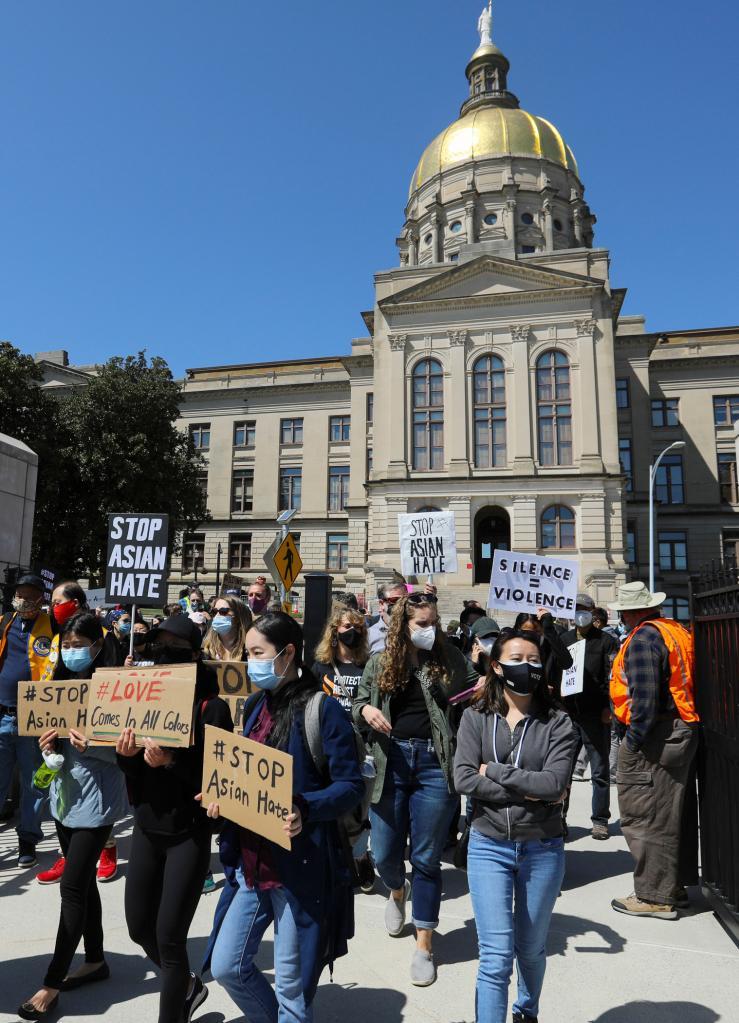 2021年3月20日,人們手持標(biāo)語在美國佐治亞州亞特蘭大市的佐治亞州議會大廈前舉行集會,抗議針對亞裔的暴力、種族歧視和仇外情緒,要求為亞特蘭大槍擊案受害者伸張正義。新華社發(fā)(王曉衡攝)