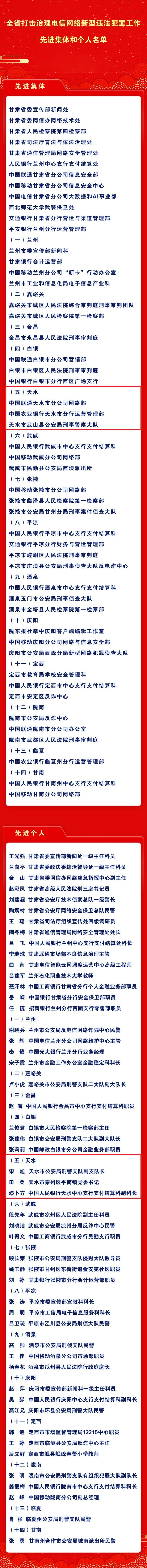 希望受到表?yè)P(yáng)的集體和個(gè)人珍惜榮譽(yù)、不驕不躁,再接再厲、再創(chuàng)佳績(jī)。各地、各成員單位要以受到表?yè)P(yáng)的集體和個(gè)人為榜樣,忠實(shí)履行好打擊治理電信網(wǎng)絡(luò)新型違法犯罪使命任務(wù),為推進(jìn)更高水平平安甘肅建設(shè)作出新的更大貢獻(xiàn)。