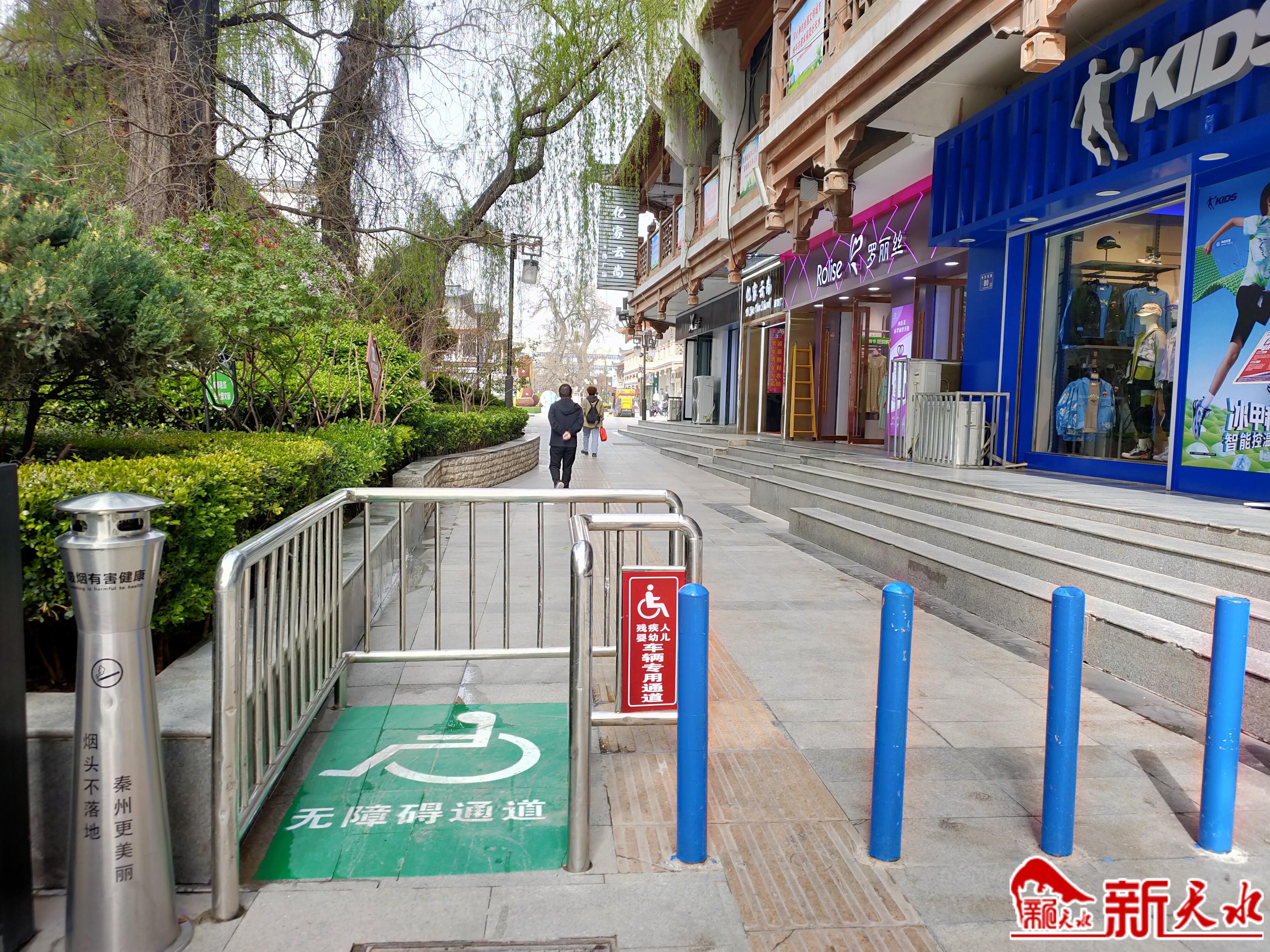 隨后,記者來(lái)到秦州區(qū)中華西路步行街、民主路以及一些巷道看到,大部分公共區(qū)域都設(shè)置了無(wú)障礙通道,供電公司、銀行、商超等公共場(chǎng)所門(mén)前也建了無(wú)障礙坡道、扶手欄桿等多處無(wú)障礙設(shè)施,為殘疾人、老年人等群體的出行創(chuàng)造了較為便利的條件。