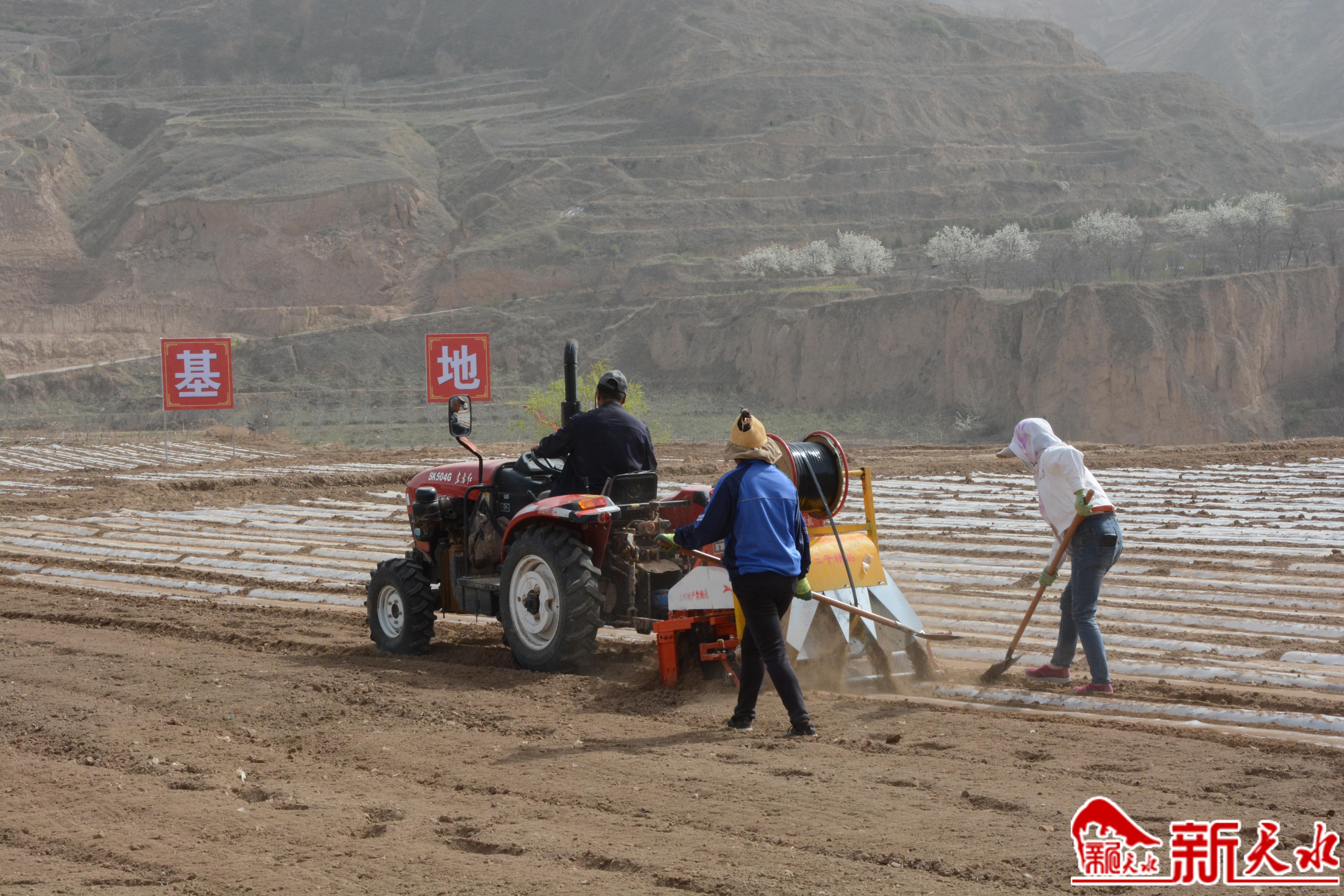 4月中旬的一個(gè)下午,楊永全和同村的幾個(gè)鄰居在安遠(yuǎn)鎮(zhèn)西城村甘谷辣椒綠色標(biāo)準(zhǔn)化生產(chǎn)基地的現(xiàn)場忙著覆膜,兩臺拖拉機(jī)帶動(dòng)覆膜綜合機(jī)械田間奔忙,把農(nóng)膜、底肥、滴灌膠帶一次鋪設(shè)到位,他負(fù)責(zé)滴灌膠帶與分水管口的安裝,“這一大片都是今年新建的辣椒基地,500多畝準(zhǔn)備全部栽植辣椒,我的1畝多地也在其中,現(xiàn)在我在合作社務(wù)工,從去年整地到現(xiàn)在鋪膜,幾個(gè)月一直有活干,幾個(gè)月忙下來我已經(jīng)掙了將近2萬元了?!彼呛堑谋忝χ种械幕钣?jì)邊說。