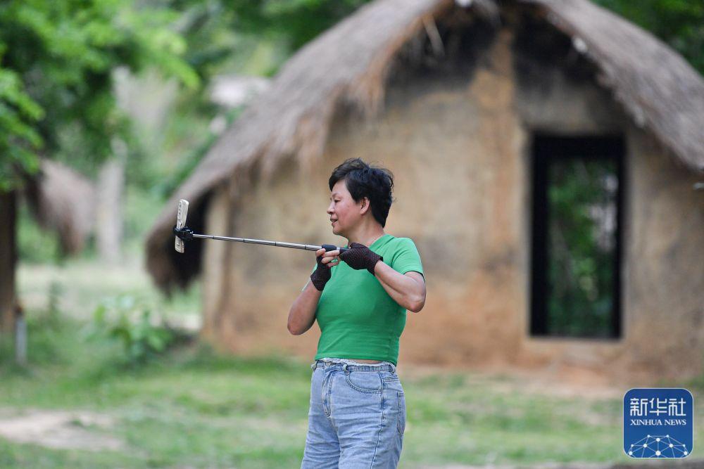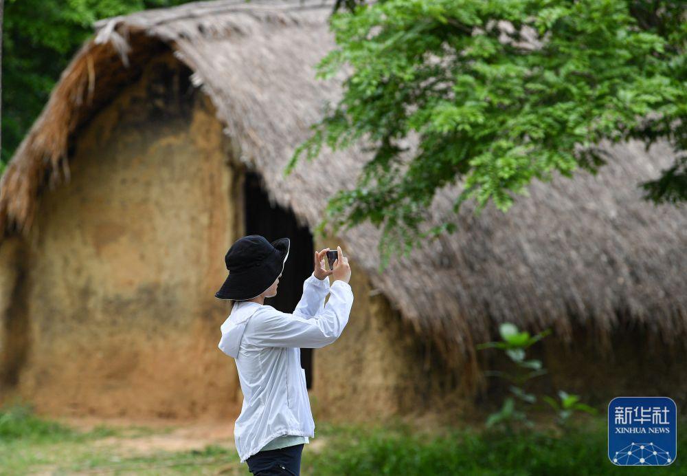 ↑4月28日,游客在海南省東方市白查村參觀、拍攝黎族船型屋。