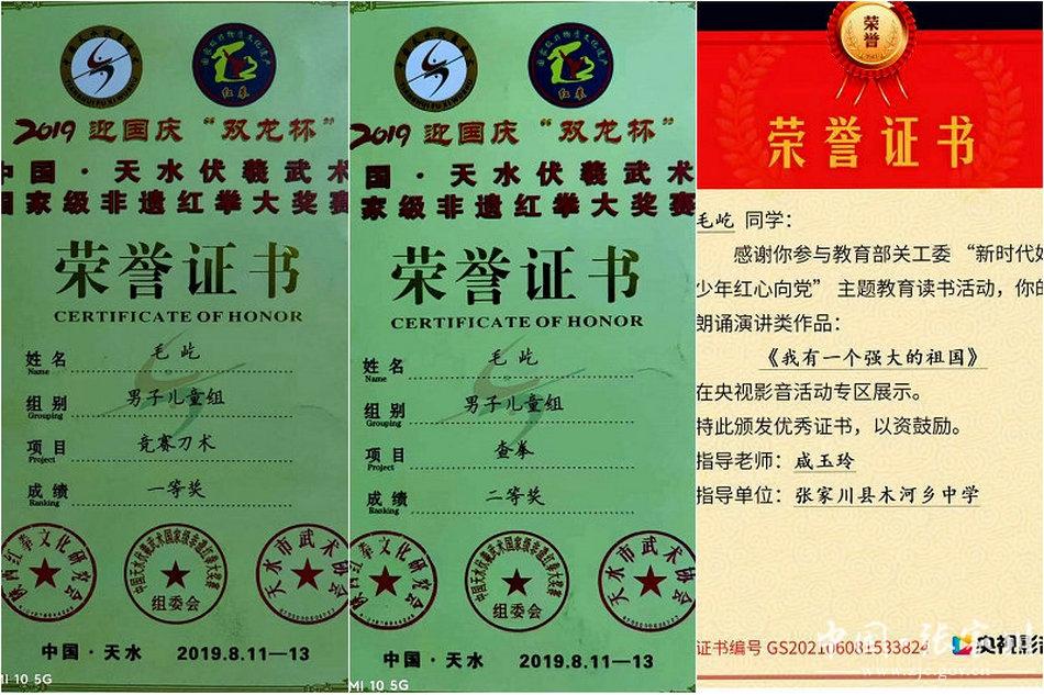 愛好廣泛,闊步向前。雛鷹展翅志高遠(yuǎn),搏擊長(zhǎng)空會(huì)有時(shí)。毛屹能夠積極參加各類體育鍛煉活動(dòng),興趣愛好十分廣泛 。他愛詩歌,作品《我有一個(gè)強(qiáng)大的祖國(guó)》在央視影音活動(dòng)專區(qū)展示,并獲得一等獎(jiǎng);他愛武術(shù),曾于2019年獲得中國(guó)·天水伏羲武術(shù)國(guó)家級(jí)非遺紅拳大獎(jiǎng)賽男子兒童組競(jìng)賽刀術(shù)一等獎(jiǎng),查拳二等獎(jiǎng);他愛創(chuàng)客創(chuàng)作,已代表學(xué)校參加全縣創(chuàng)客大賽。這些愛好既豐富了他的課余生活,也陶冶了他的情操,提高了自身的綜合素質(zhì)。