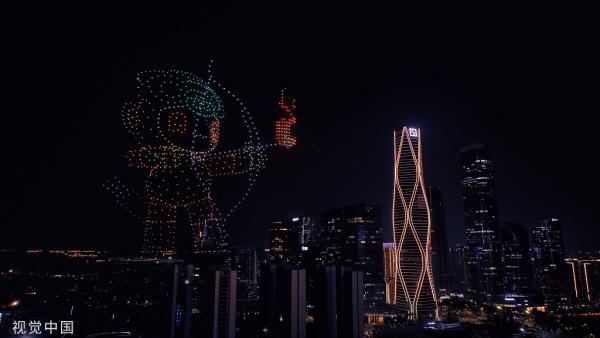 杭州亞運會倒計時100天 杭州大火炬被千架無人機點亮。(視覺中國)