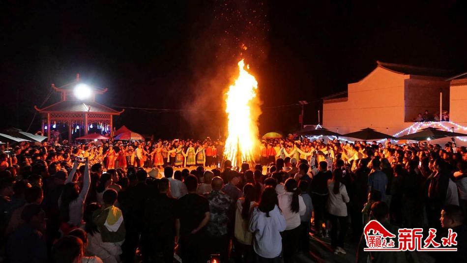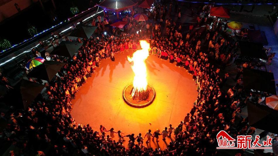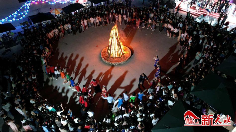 晚上10點(diǎn),節(jié)目演出完畢,廣場(chǎng)中央2米多高的火堆點(diǎn)燃,圍繞熊熊篝火,人們翩翩起舞。