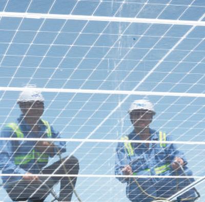 港區(qū)工人清潔屋頂光伏板,影子映在光伏板上。本報(bào)記者 李 舸攝