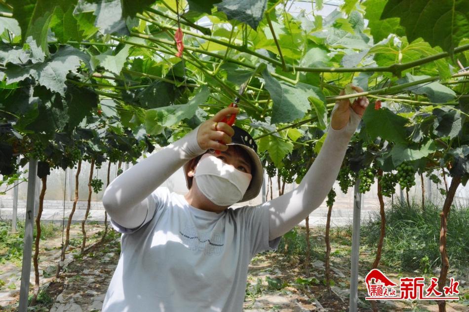 “我來這里干活,一天有100元的勞務(wù)費,這里離家也近,務(wù)工的同時還能照顧家里,一年下來也能有1萬多元的收入?!卑策h鎮(zhèn)鞏川村村民鞏世斌常年在葡萄大棚進行管護和采收工作,手中的剪刀上下翻飛,正麻利地剪除弱果、小果。