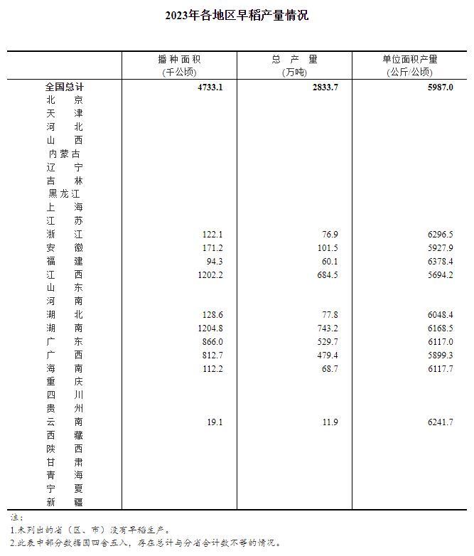 根據(jù)早稻抽樣調(diào)查結(jié)果推算,2023年全國(guó)早稻播種面積、單位面積產(chǎn)量、總產(chǎn)量如下: