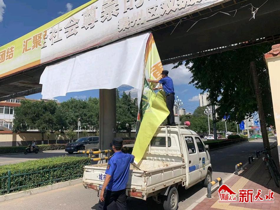 新天水訊【通訊員朱學(xué)勇】近日,秦州區(qū)執(zhí)法局天水郡中隊(duì)開(kāi)展戶外廣告和招牌設(shè)施排查治理工作,及時(shí)消除安全隱患。