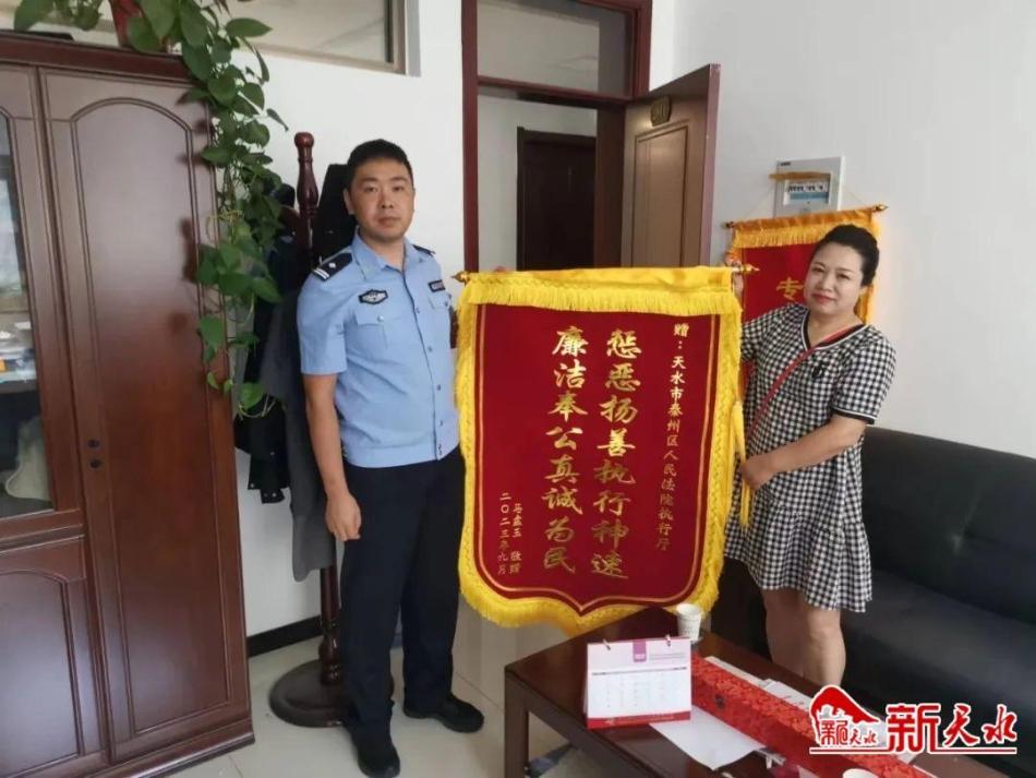 新天水訊【記者何慧娟】“案子已經(jīng)兩年了,我也知道被執(zhí)行人沒什么財產(chǎn),執(zhí)行起來特別困難。但是承辦法官一直盡心盡力查控,確實(shí)特別感謝?!?月12日上午,當(dāng)事人馬某將一面寫有“懲惡揚(yáng)善執(zhí)行神速 廉潔奉公真誠為民”的錦旗送到了秦州區(qū)人民法院執(zhí)行局,由衷地感謝法院和執(zhí)行法官司法為民、高效執(zhí)行的工作作風(fēng)。