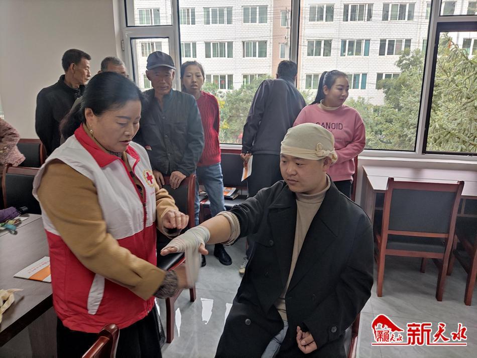 活動中,清水縣紅十字會老師講解了救護的基本背景與常識,教授了應(yīng)急救護知識,包括心肺復(fù)蘇術(shù)、創(chuàng)傷救護、繃帶包扎、常見急癥和意外傷害處置知識的規(guī)范操作等。在實踐環(huán)節(jié),社區(qū)工作人員借助道具組隊練習(xí),現(xiàn)場鞏固知識,培訓(xùn)老師在一旁耐心指正糾錯,學(xué)習(xí)氛圍濃厚,成效顯著。
