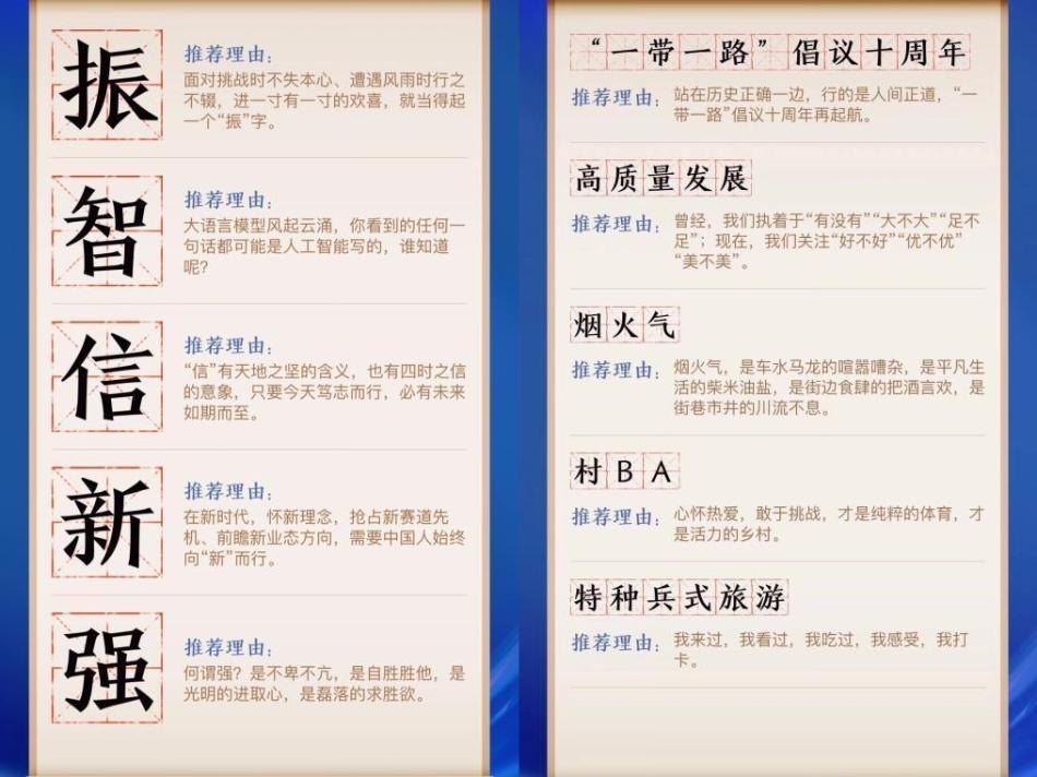 前五位年度國內(nèi)候選字為“振”“智”“信”“新”“強(qiáng)”,前五位年度國內(nèi)候選詞為“‘一帶一路’倡議十周年”“高質(zhì)量發(fā)展”“煙火氣”“村BA”“特種兵式旅游”;前五位年度國際候選字為“?!薄靶尽薄皯?zhàn)”“談”“核”,前五位年度國際候選詞為“戰(zhàn)爭”“ChatGPT”“核污染水”“芯片”“巴以沖突”。
