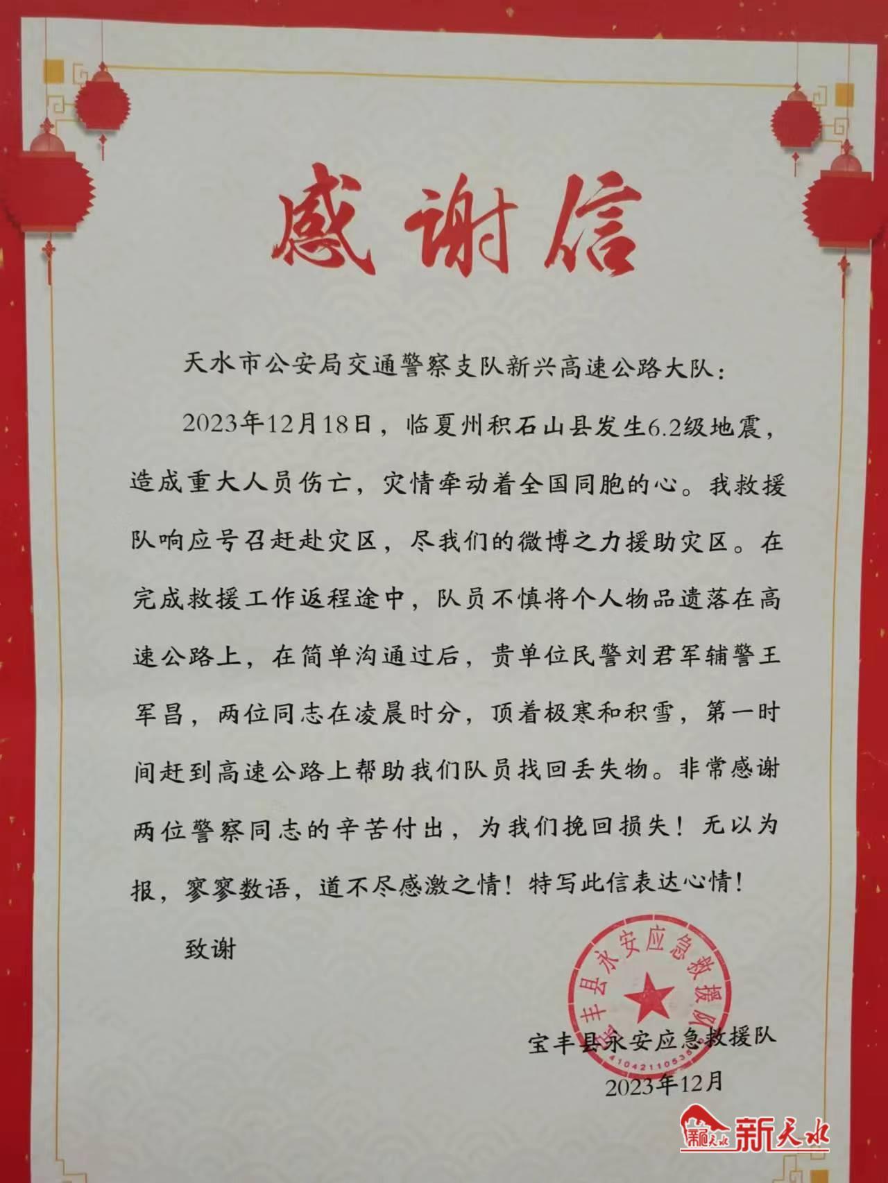 新天水訊【記者王曉華】“貴單位兩位民警在晚上,冒著嚴(yán)寒到高速公路上幫助我們隊(duì)員找回丟失物品,在此對(duì)警察同志的辛苦付出表示感謝。”12月底,天水市公安局交警支隊(duì)新興高速公路大隊(duì)收到了一封感謝信,表達(dá)對(duì)民警的感激之情。