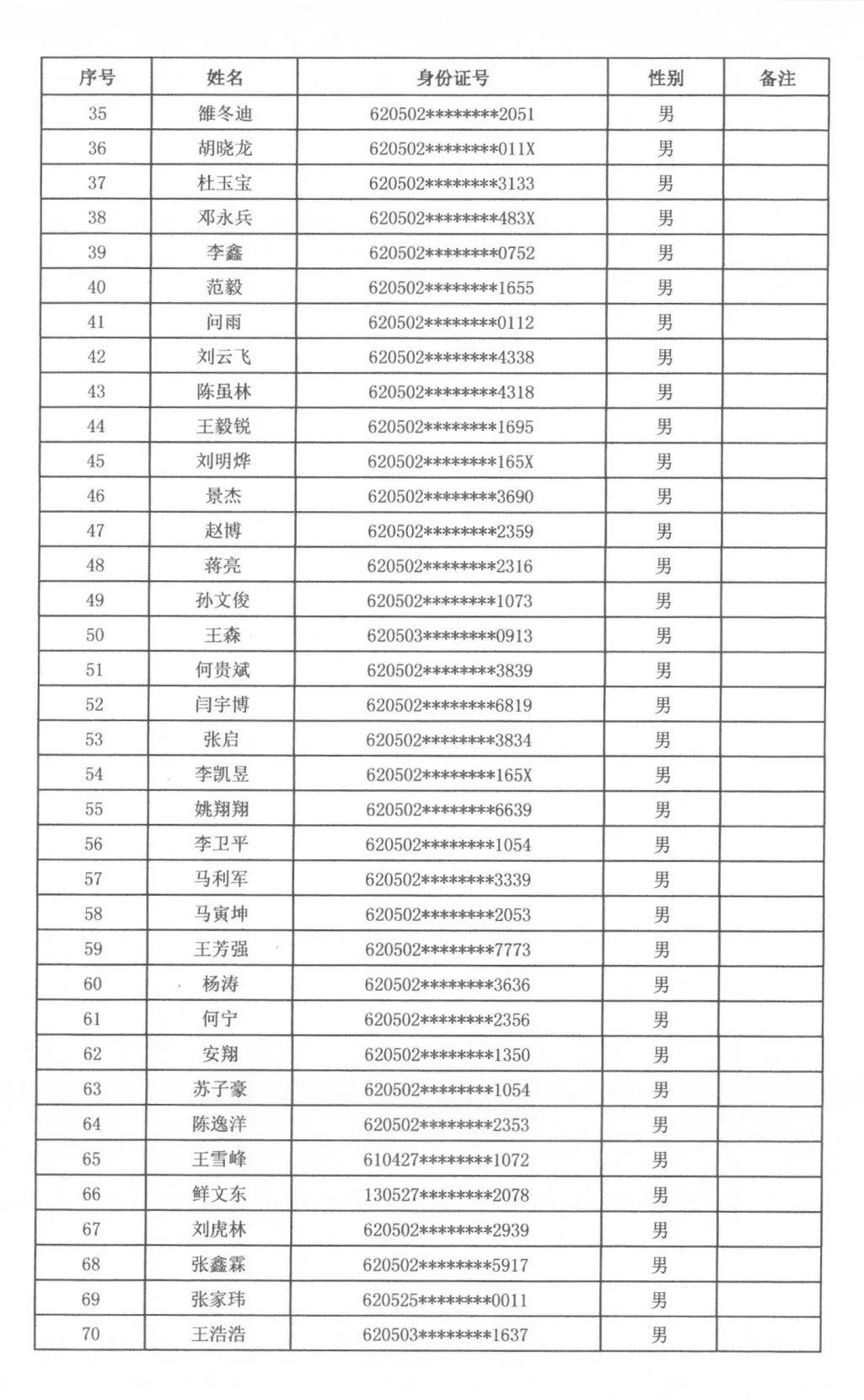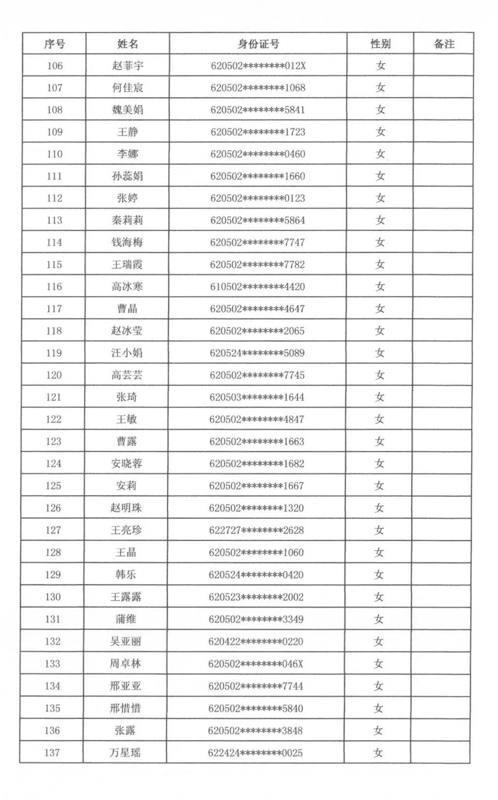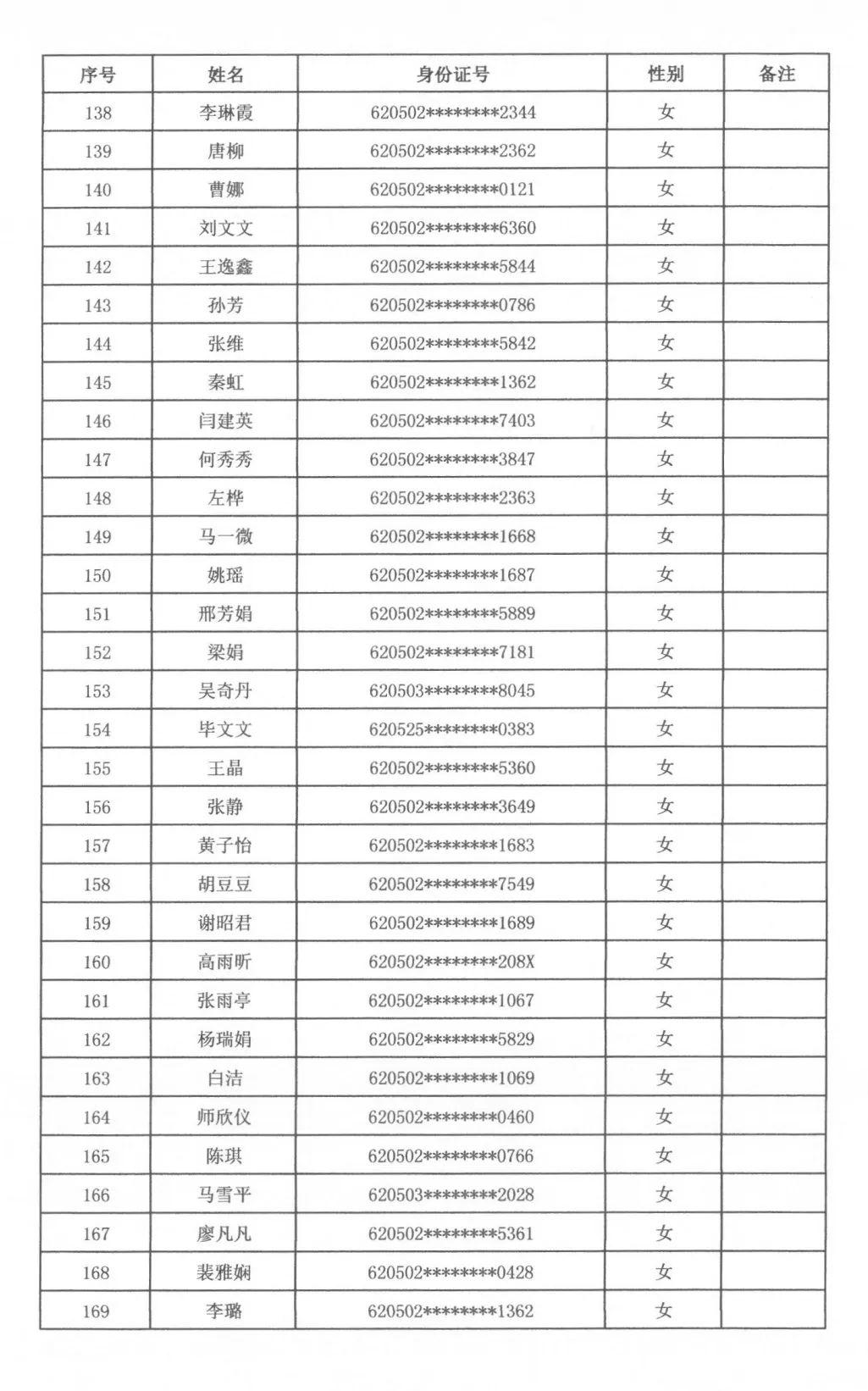 根據(jù)天水市秦州區(qū)人力資源和社會保障局、天水市公安局秦州分局關于2023年公開招聘警務輔助人員工作安排,通過筆試、面試、體檢、政審,擬聘用警務輔助人員男性97名、女性72名,現(xiàn)將擬聘用人員名單公示如下,廣泛接受社會各界的監(jiān)督。公示期滿后,將按程序辦理聘用派遣手續(xù)。