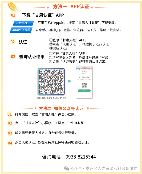 2.現(xiàn)場認證。自主認證不成功的、使用智能手機有困難的人員可攜帶身份證到就近的街道(社區(qū))或秦州區(qū)人社局一樓服務大廳(南明路梧林苑4號)5號窗口進行現(xiàn)場認證。