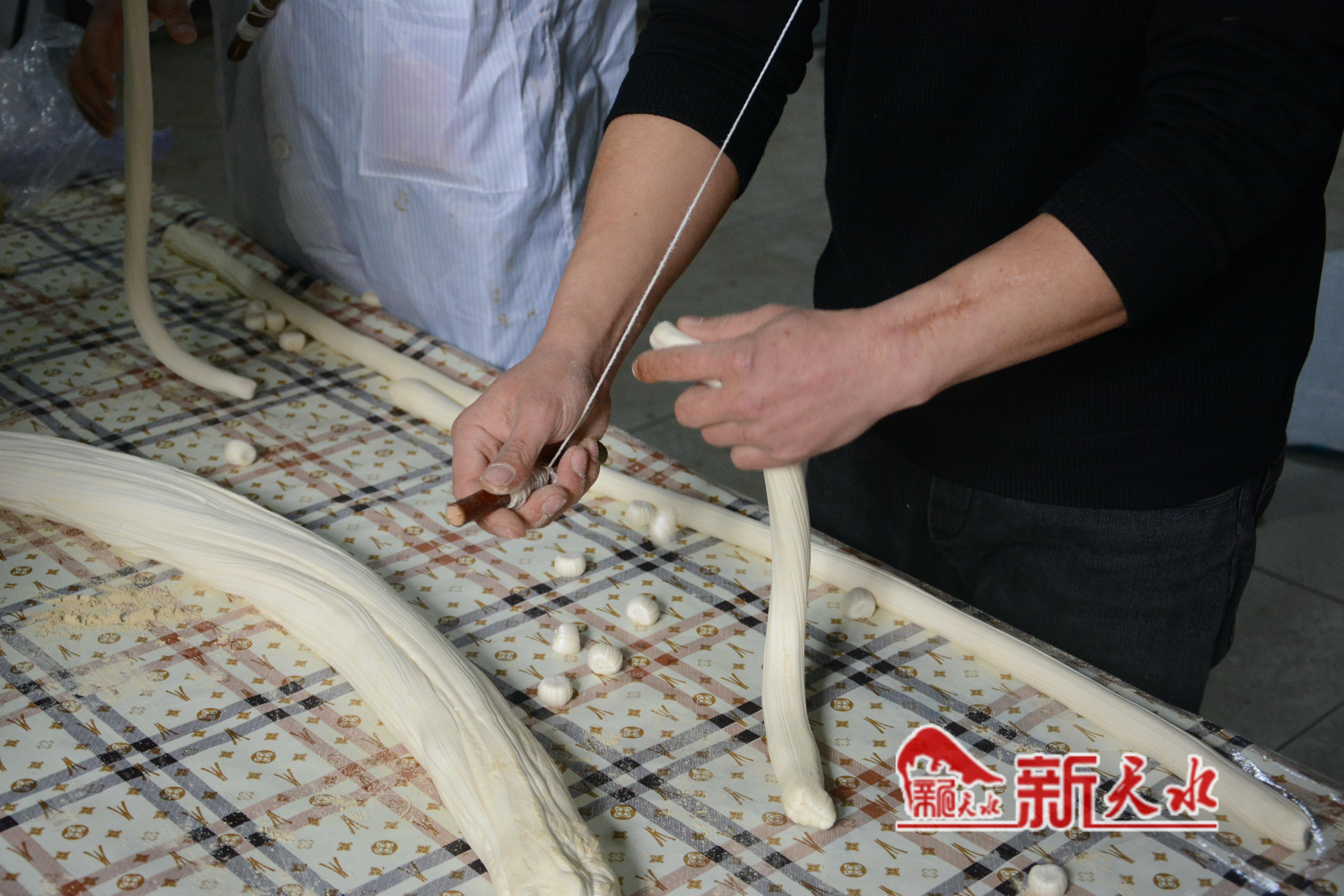 每逢小年,在街頭叫賣的一顆顆灶糖其實并不是用剪子剪切的,而是用繩子勒出來的,這就是具有石佛灶糖特色的勒糖。田覲偉左手握糖條,右手將系有尼龍繩的木柄纏繞在糖條上迅速勒斷,大小均勻的灶糖便散落在操作臺上,然后放進包裝盒。一鍋40斤的糖稀,制作出灶糖、荏板糖等不同的品種,需要6至7人相互配合花費一天的時間。因歷史悠久、工藝精巧,石佛飴糖制作技藝2007年被麥積區(qū)政府列入第一批非遺名錄,2008年被列入市級第二批非遺名錄。