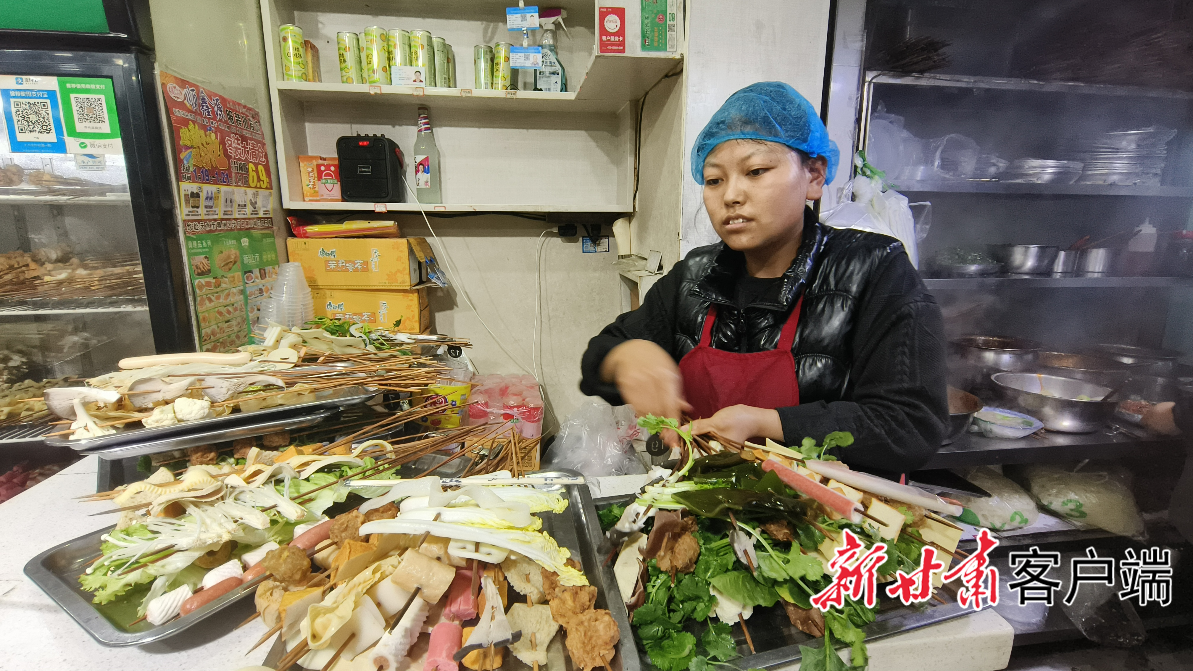 走訪中,記者了解到,天水麻辣燙多以串串形式呈現(xiàn),菜品種類繁多,一串1到2元,食客可按喜好自取。麻辣燙的調(diào)料形式也是不拘小節(jié),一大勺辣椒、一小勺的花生米……只要是食客需要,都可按需添加。