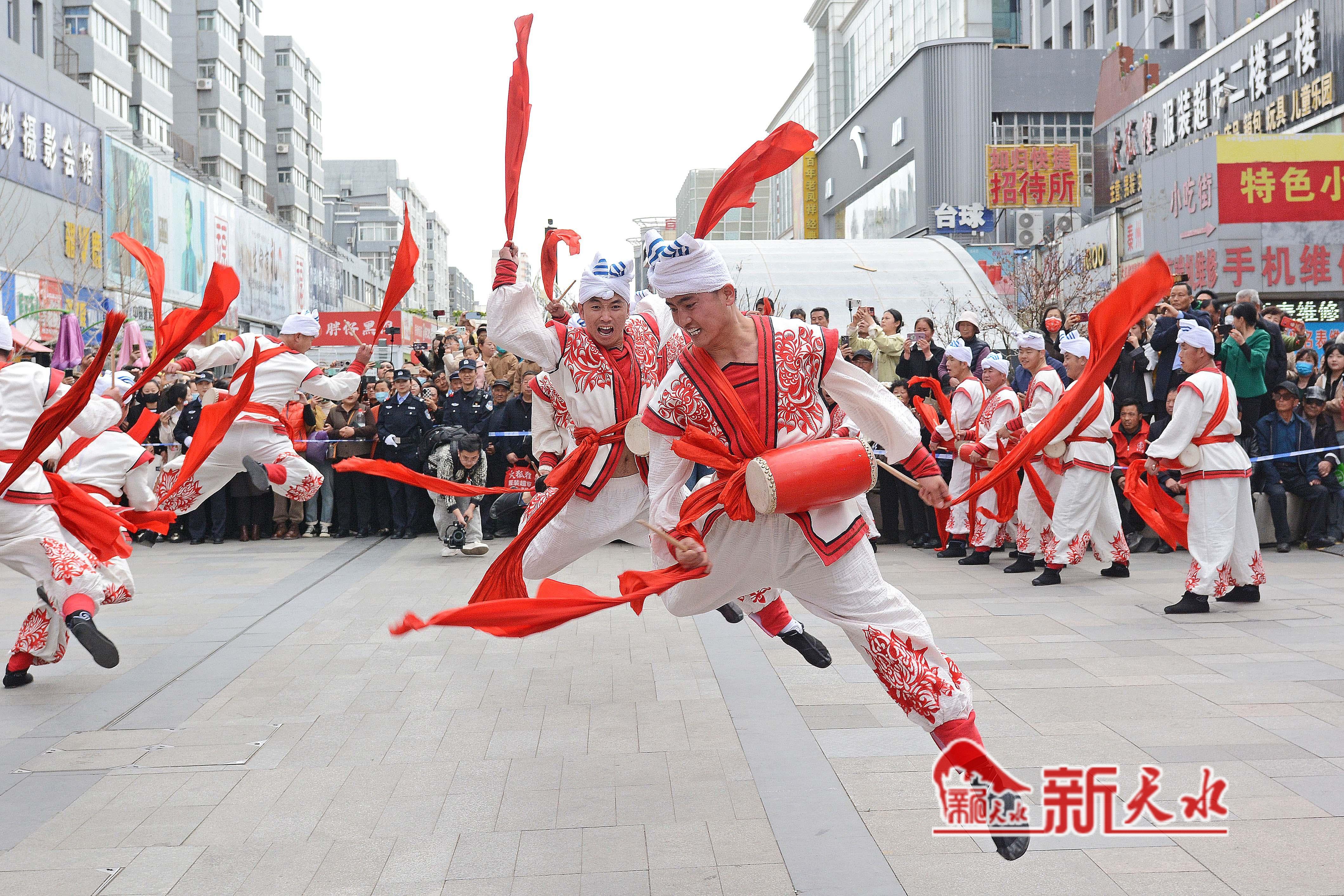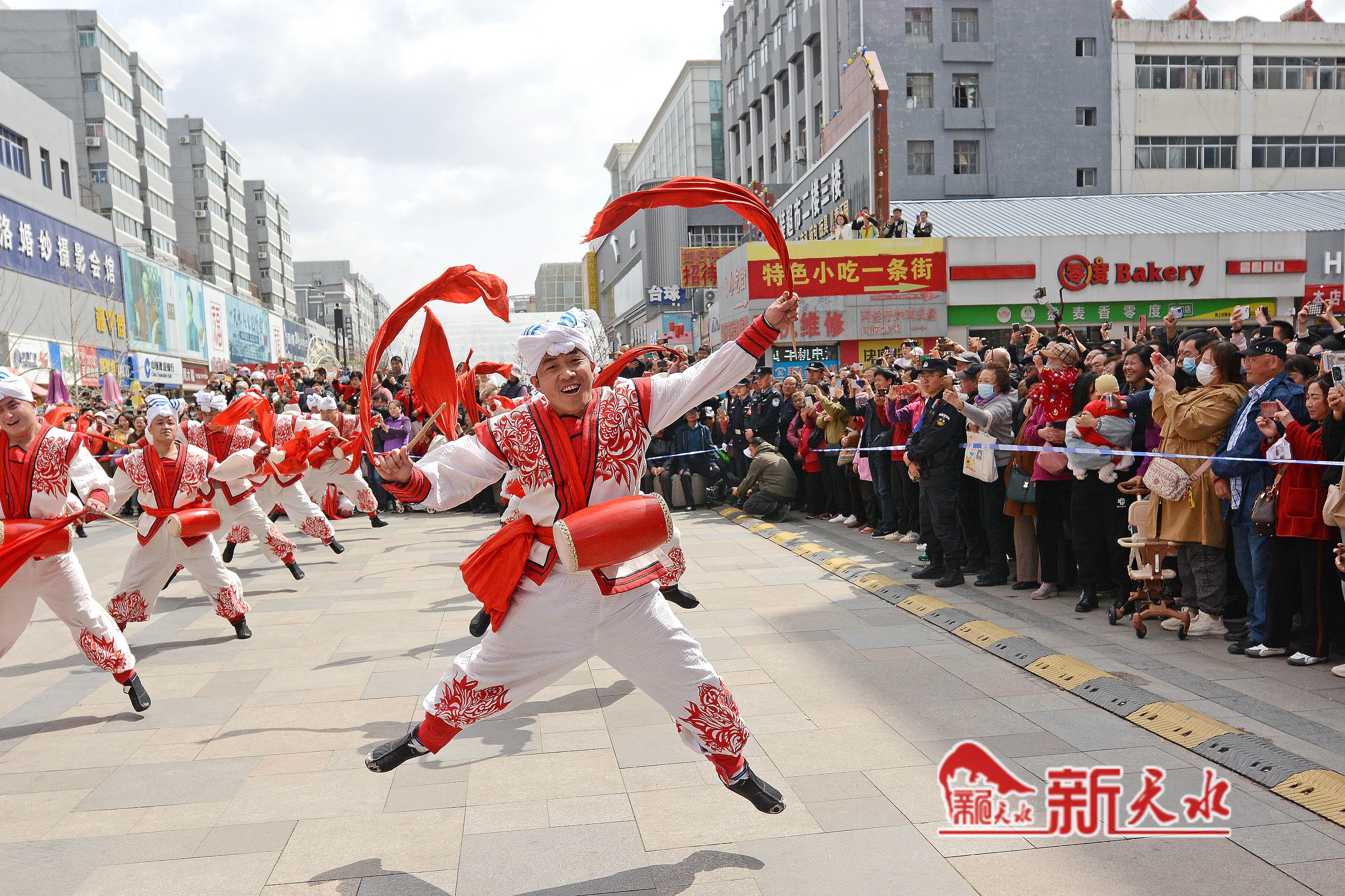 3月27日,陜西省榆林市橫山老腰鼓表演隊(duì)在天水市秦州、麥積兩區(qū)“激情鼓舞”,為天水麻辣燙鼓勁加油,體現(xiàn)陜甘一家親的深情厚意。