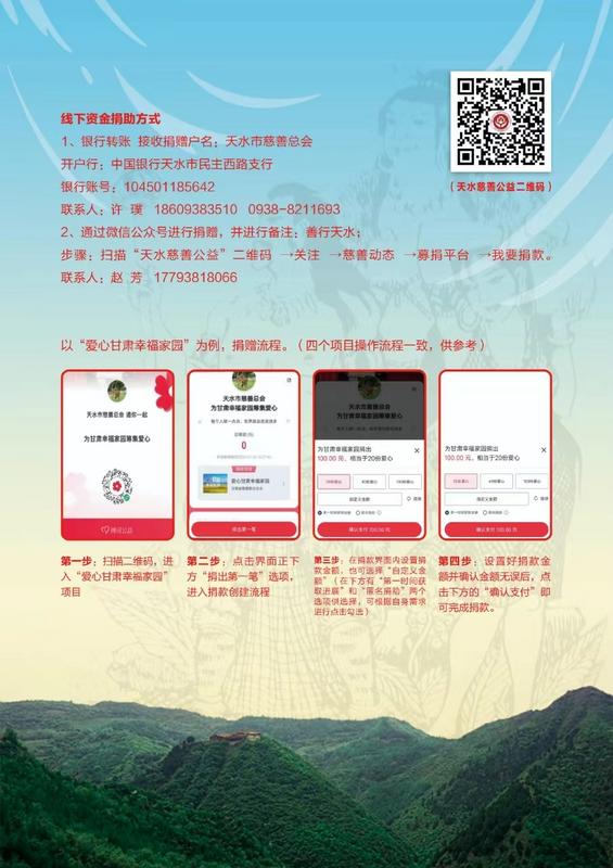 步驟:掃描“天水慈善公益”二維碼→關(guān)注→慈善動態(tài)→募捐平臺→我要捐款。