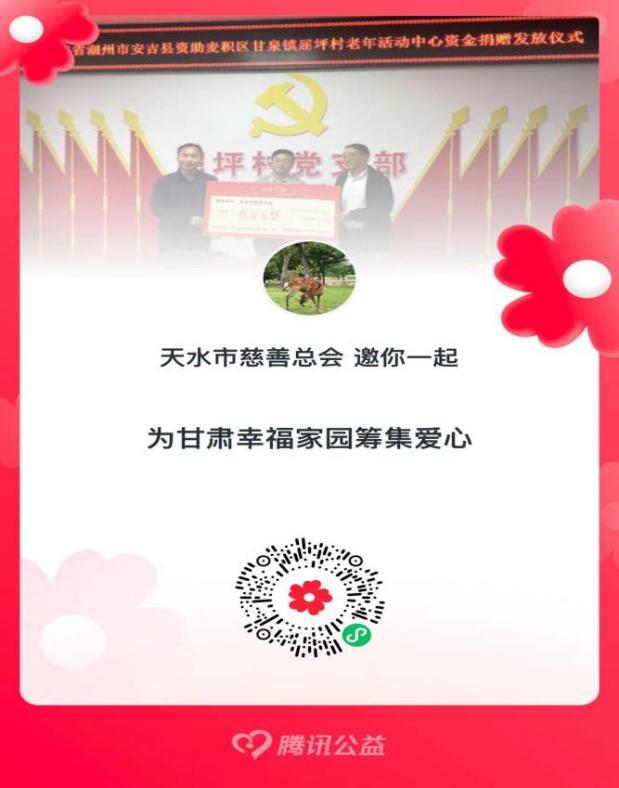 四、參與方式及項(xiàng)目設(shè)置。參與方式以網(wǎng)絡(luò)捐贈(zèng)為主。本次活動(dòng)以“愛(ài)心甘肅結(jié)對(duì)幫扶”和“慈善助力鄉(xiāng)村振興”為主題,天水市及各縣區(qū)慈善總會(huì)采用甘肅省慈善聯(lián)合總會(huì)上線的《愛(ài)心甘肅幸福家園》《愛(ài)心甘肅慈善助學(xué)》《我在甘肅種棵樹(shù)》《慈善文化進(jìn)校園》四類(lèi)項(xiàng)目發(fā)起一起捐。指尖慈善,無(wú)論捐贈(zèng)多少,都是對(duì)我們慈善公益事業(yè)的莫大支持和鼓勵(lì)。歡迎您從2024年8月5日起,按以上一起捐四類(lèi)慈善項(xiàng)目進(jìn)行線上捐贈(zèng)。用手機(jī)掃描其二維碼點(diǎn)擊“捐一筆”,即可在騰訊公益平臺(tái)上進(jìn)行自愿捐款,倡導(dǎo)人人參與、量力而行。還可以組織單位捐款,在募捐項(xiàng)目中選擇“一起捐”分享捐贈(zèng)鏈接邀請(qǐng)您的親人、朋友及同事進(jìn)行捐贈(zèng)。同時(shí),也歡迎單位和個(gè)人通過(guò)線下捐贈(zèng)的形式,通過(guò)銀行轉(zhuǎn)賬直接向本縣區(qū)和天水市慈善總會(huì)的捐款賬戶進(jìn)行捐贈(zèng),捐贈(zèng)善款計(jì)入天水市、縣區(qū)和全省活動(dòng)募捐總額,但不計(jì)入本次活動(dòng)的激勵(lì)額度。