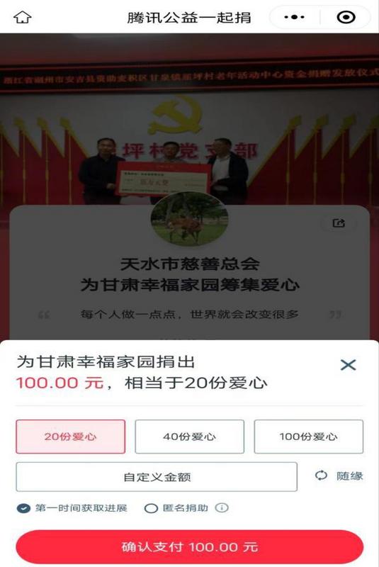 為貫徹落實(shí)黨中央、國(guó)務(wù)院關(guān)于實(shí)施鄉(xiāng)村振興戰(zhàn)略的決策部署和省市黨委、政府“愛(ài)心甘肅·結(jié)對(duì)幫扶”的實(shí)施意見(jiàn),為鄉(xiāng)村振興貢獻(xiàn)慈善力量,甘肅省慈善聯(lián)合總會(huì)決定從今年8月5日起舉辦首次“愛(ài)心甘肅”慈善數(shù)字公益節(jié)集中網(wǎng)絡(luò)籌募活動(dòng),天水市及各縣區(qū)慈善公益機(jī)構(gòu)將同步開(kāi)展“一起捐”籌募活動(dòng)。倡議機(jī)關(guān)、企事業(yè)單位干部職工和經(jīng)濟(jì)成功人士、廣大志愿者及社會(huì)各界愛(ài)心人士自愿參與線上捐贈(zèng),奉獻(xiàn)愛(ài)心。