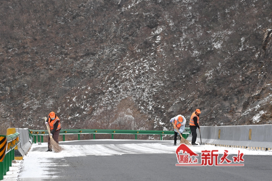 12月10日,車(chē)輛行駛在武山縣城鄉(xiāng)道路,養(yǎng)路工人清掃公路、懸掛路牌。