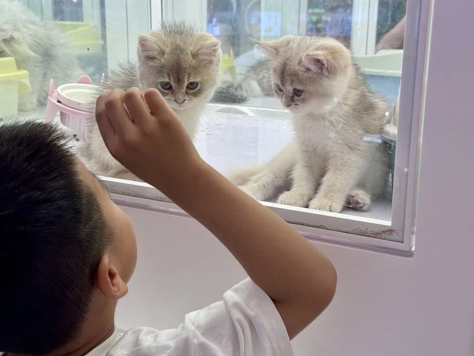 記者以領(lǐng)養(yǎng)人的身份實地走訪了北京一家“貓咪認(rèn)養(yǎng)館”門店,店內(nèi)有二十余個透明的格子展柜,每格分別圈養(yǎng)著金漸層、布偶、德文等熱門品種的幼貓。