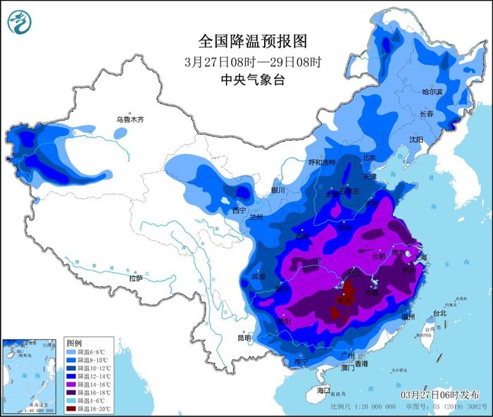 預(yù)計(jì),3月27日08時(shí)至29日08時(shí),新疆南疆盆地、西北地區(qū)中東部、內(nèi)蒙古中東部、華北西部、黃淮、江淮、江漢、江南、華南大部以及四川東北部、重慶東北部、貴州東部、黑龍江中東部、吉林東部等地將降溫8~10℃,其中,新疆南疆盆地、甘肅中部、華北西部、黃淮、江淮、江南、華南北部、貴州東部等地部分地區(qū)降溫可達(dá)12~16℃,局地超過18℃。