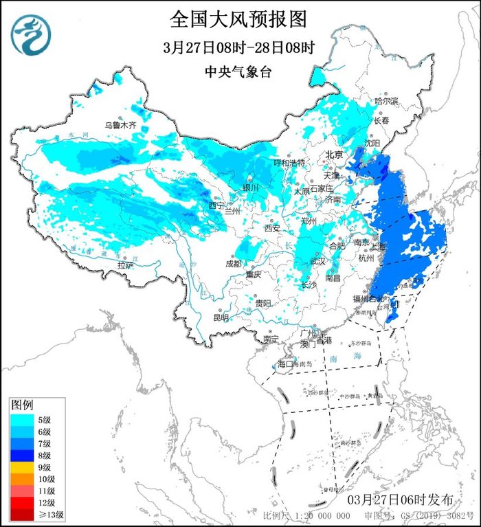 預(yù)計(jì),3月27日08時(shí)至28日08時(shí),新疆北疆東部和南疆盆地、西藏中北部、青海大部、內(nèi)蒙古大部、甘肅北部和東部、寧夏大部、陜西北部、山西中北部、河北、北京、天津、遼寧中西部和遼東半島、吉林西部、山東半島、河南、江蘇、安徽、湖北中東部、湖南中北部、江西北部以及四川東北部等地的部分地區(qū)有5~6級(jí)風(fēng)、陣風(fēng)7~9級(jí);渤海、渤海海峽、黃海大部海域、東海大部海域?qū)⒂?~8級(jí)、陣風(fēng)9~10級(jí)的大風(fēng)。