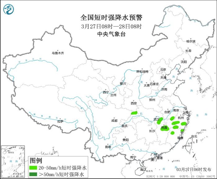 預(yù)計(jì)3月27日08時(shí)至28日08時(shí),安徽南部、湖北東部、江西中北部、浙江中南部、福建北部等地的部分地區(qū)將有8級(jí)以上雷暴大風(fēng)或冰雹天氣;安徽南部、湖北東部、江西中北部、浙江中南部、福建中北部等地的部分地區(qū)將有小時(shí)雨量大于20毫米的短時(shí)強(qiáng)降水天氣。