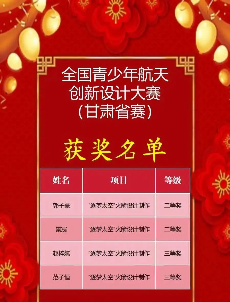 麥積區(qū)道南小學(xué)4名學(xué)生參加全國青少年航天創(chuàng)新大賽甘肅選拔賽,獲得二等獎2人次,三等獎2人次。