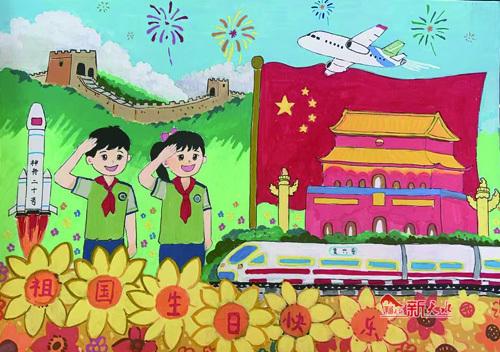 下午時(shí)分,奶奶把我?guī)У搅松鐓^(qū)活動(dòng)中心。這里正在舉辦迎國(guó)慶書(shū)畫(huà)展,墻上展出了很多畫(huà),最引人注目的是一幅展現(xiàn)祖國(guó)科技進(jìn)步的畫(huà)。畫(huà)中一列高鐵正飛馳在草地上,藍(lán)天下還有幾枚火箭也飛向遠(yuǎn)方。幾位爺爺在聽(tīng)收音機(jī),里面剛好說(shuō)哪兒又新修了一座特別雄偉的大橋。滿臉皺紋的奶奶聽(tīng)見(jiàn)了,高興地說(shuō):“國(guó)家發(fā)展就是快,現(xiàn)在出行旅游真方便?!?/p>