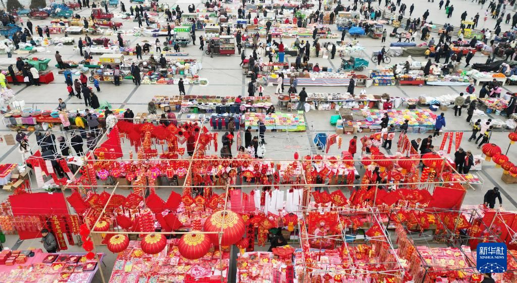 2月4日,在甘肅省臨夏回族自治州永靖縣劉家峽鎮(zhèn)年貨市場,人們選購年貨(無人機照片)。