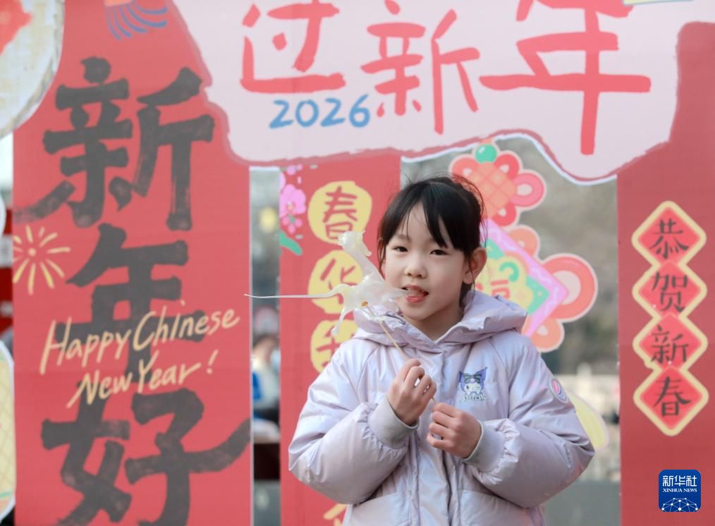 2月4日,在江蘇省揚州市錦旺社區(qū)“非遺迎新春”市集活動中,一名小朋友在品嘗糖人。新華社發(fā)(孟德龍攝)