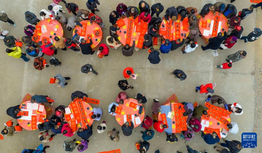 2月5日,在河南省焦作市溫縣黃莊鎮(zhèn)后崔莊村,書法家為村民書寫福字和春聯(lián)(無人機照片)。新華社發(fā)(黃福興攝)
