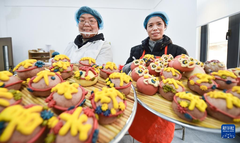 2月4日,在河南省洛陽市西工區(qū)紅山街道棗園社區(qū)花饃工坊內(nèi),工人展示制作好的花饃。新華社發(fā)(黃政偉攝)