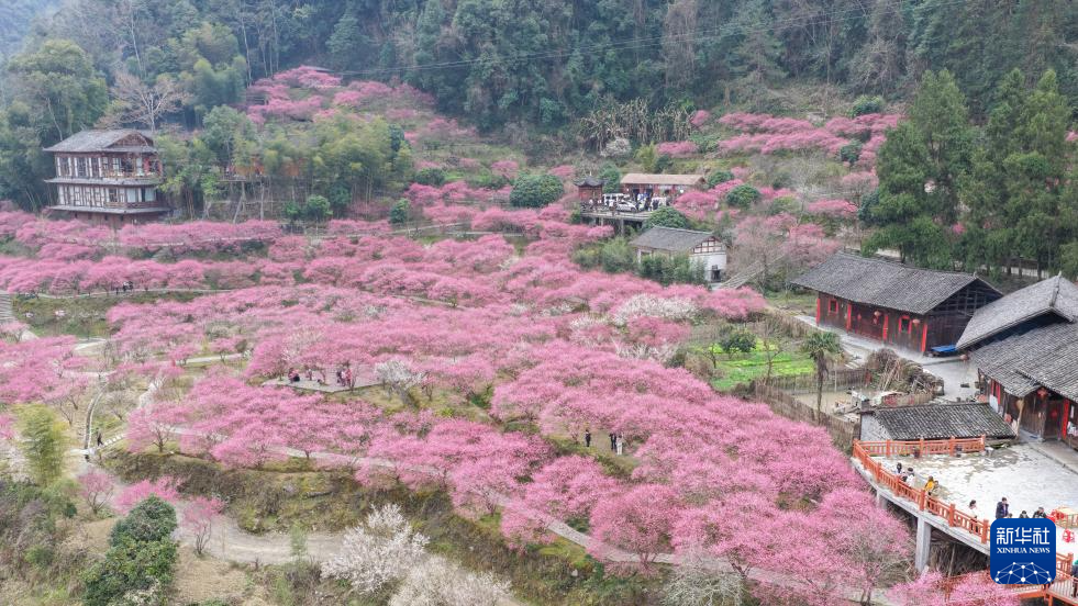 2月12日,游客在湖南省湘西土家族苗族自治州永順縣靈溪鎮(zhèn)土家竹梅山寨陳家坡賞梅(無人機照片)。新華社發(fā)(曾勇 攝)