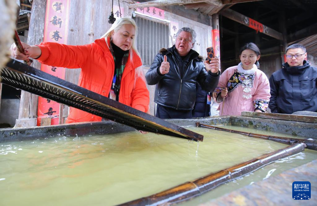 2月12日,在湖南省湘西土家族苗族自治州永順縣靈溪鎮(zhèn)洞坎村,游客體驗湘西手工抄紙。新華社發(fā)(曾勇 攝)