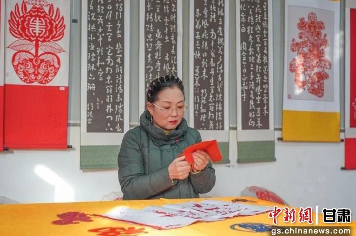 圖為秦安剪紙?zhí)焖屑?jí)傳承人安梅霞在剪紙。秦安縣融媒體中心供圖