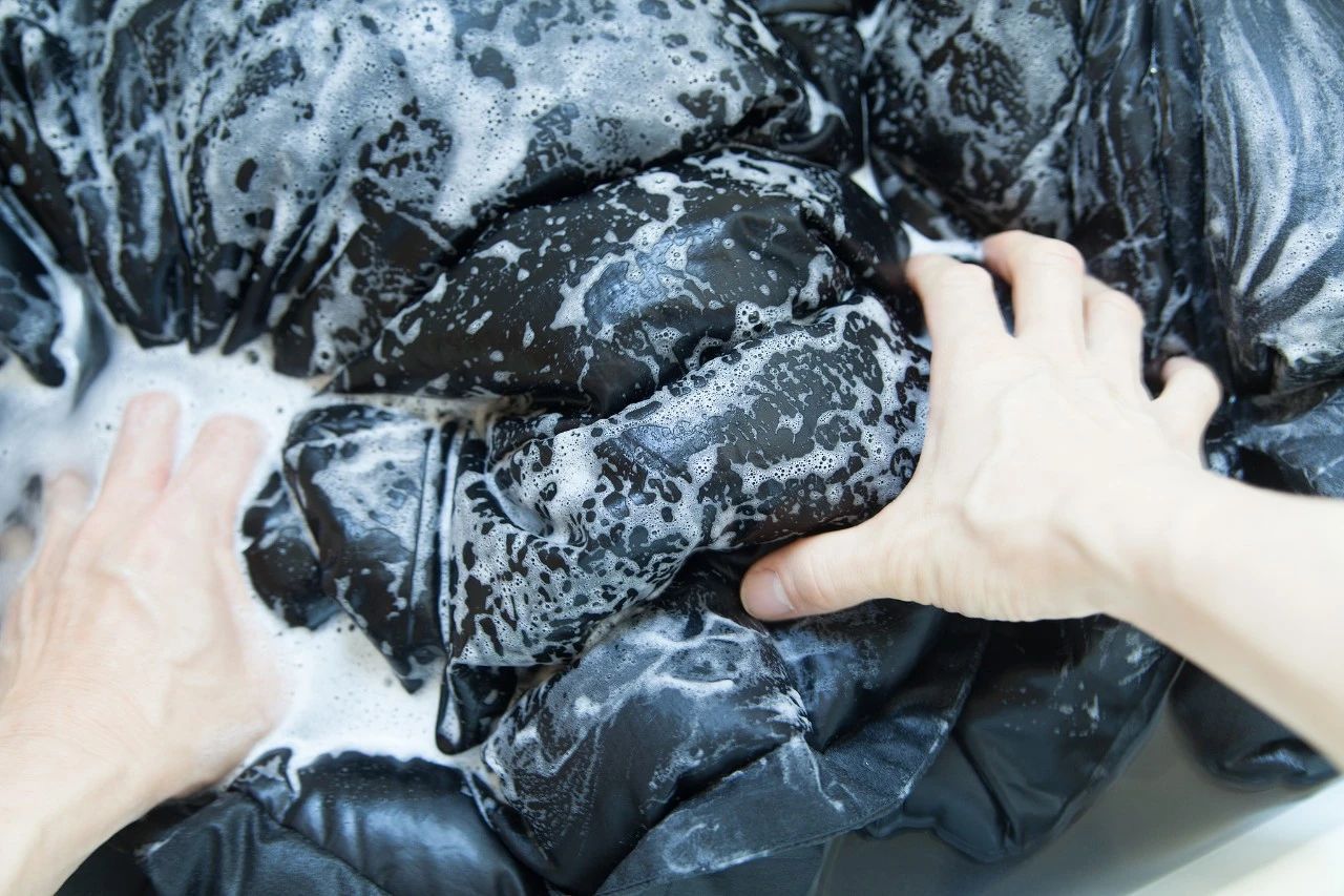 準(zhǔn)備一盆溫水,將羽絨服充分浸濕,放入洗滌劑后浸泡10分鐘;