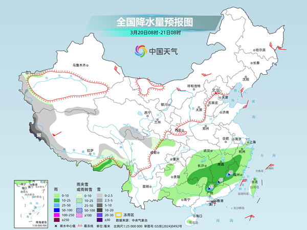 具體地,中央氣象臺預計,今天,新疆南疆西部山區(qū)、西藏西部和南部、青海南部、川西高原北部等地部分地區(qū)有小到中雪或雨夾雪,其中,西藏西部等地部分地區(qū)有大到暴雪,局地大暴雪。貴州東部、江南大部、華南北部和西部、海南島中部、臺灣島東部等地部分地區(qū)有小到中雨,其中,江西南部、福建西部、廣東西北部等地部分地區(qū)有大雨。