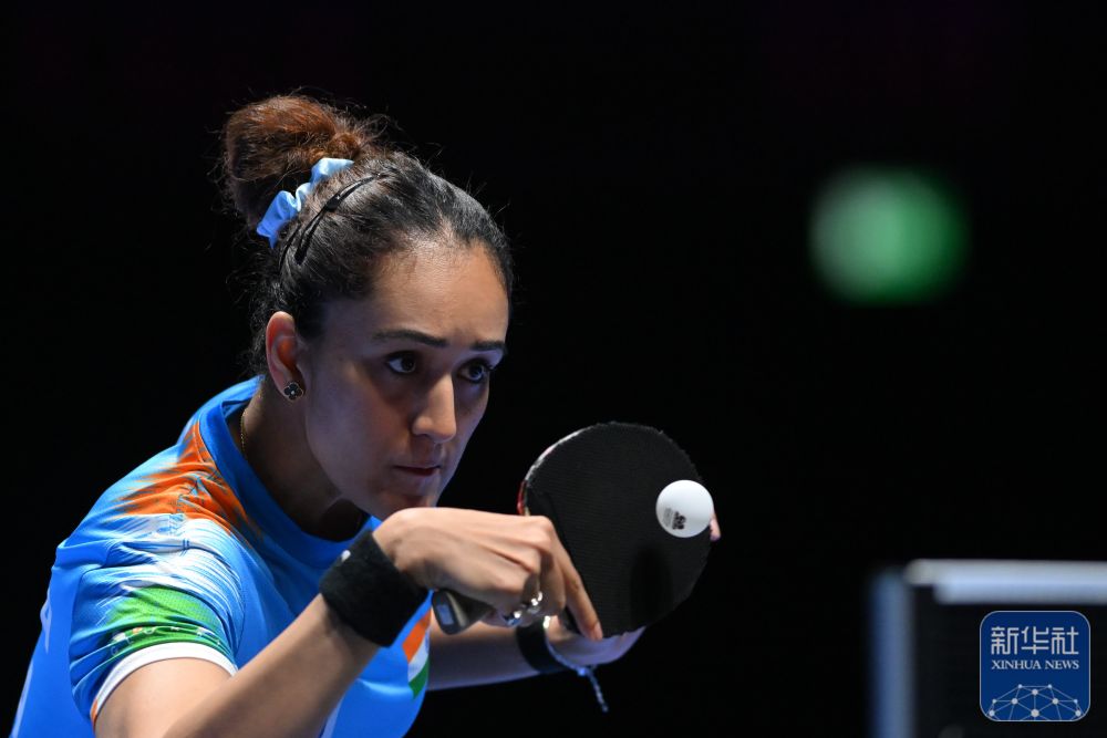 ↑印度選手馬妮卡·巴特拉在女子單打小組賽中回球。最終,她0比3不敵日本選手張本美和。