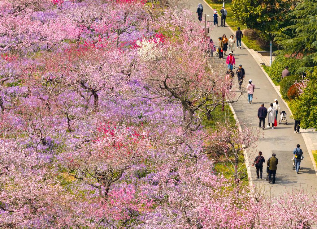 3月28日,游客在江蘇淮安桃花塢公園賞花游玩。新華社發(fā)(賀敬華 攝)