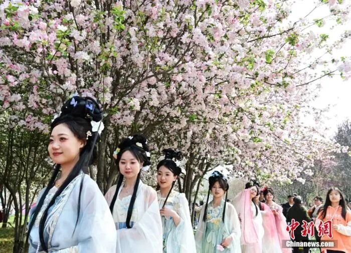 資料圖:河北省石家莊市欒城區(qū)一公園,身著古裝服飾的游客踏青游玩,享受美好春光。中新社記者 翟羽佳 攝