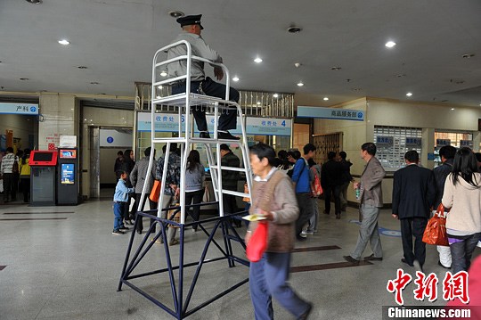????3月26日,云南省第一人民醫(yī)院門診部收費(fèi)處附近擺放了兩把高近3米的“瞭望凳”,保安坐在上面,居高臨下提醒排隊(duì)等候掛號、取藥的患者小心被盜。這是昆明公安局借鑒外省警方經(jīng)驗(yàn),在昆明首創(chuàng)的“瞭望凳”防小偷新舉措。