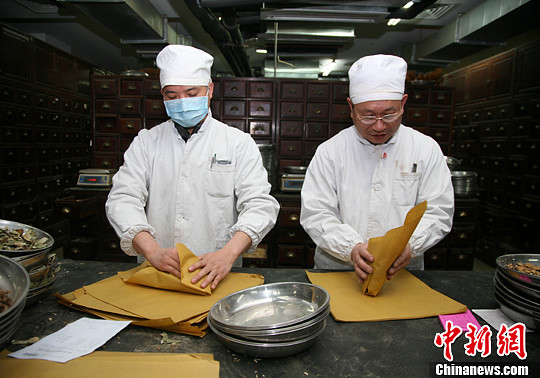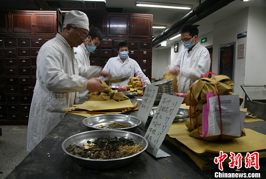 ????4月7日,記者在浙江省中醫(yī)院中藥房內(nèi)發(fā)現(xiàn),醫(yī)師們正在配置中藥。中新社發(fā) 李晨韻 攝