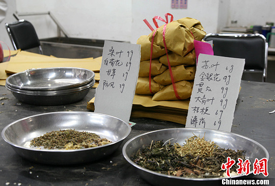 ????4月7日,記者在浙江省中醫(yī)院中藥房內(nèi)看到,桌上擺放著已配置好的中藥。中新社發(fā) 李晨韻 攝
