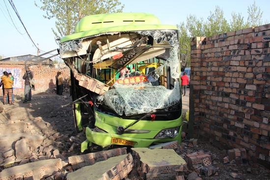 ????2013年4月9日14時(shí)左右,在河南平頂山市新華區(qū)果店村附近,一輛車牌號(hào)為豫d82908,滿載40多名乘客的8路公交車司機(jī)疑疲勞駕駛,致使公交車直接撞塌長(zhǎng)約6、7米的圍墻,導(dǎo)致車中大概40多乘客不同程度受傷。受傷人員被送往該市第二人民醫(yī)院治療。其中一懷孕4個(gè)月左右孕婦昏迷,一對(duì)夫妻傷勢(shì)嚴(yán)重,現(xiàn)在該院急診室搶救中。圖為事故現(xiàn)場(chǎng)。